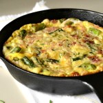 Return the cooked bacon to the pan and pour the egg mixture on top. Bake for about 15 minutes, or until set.